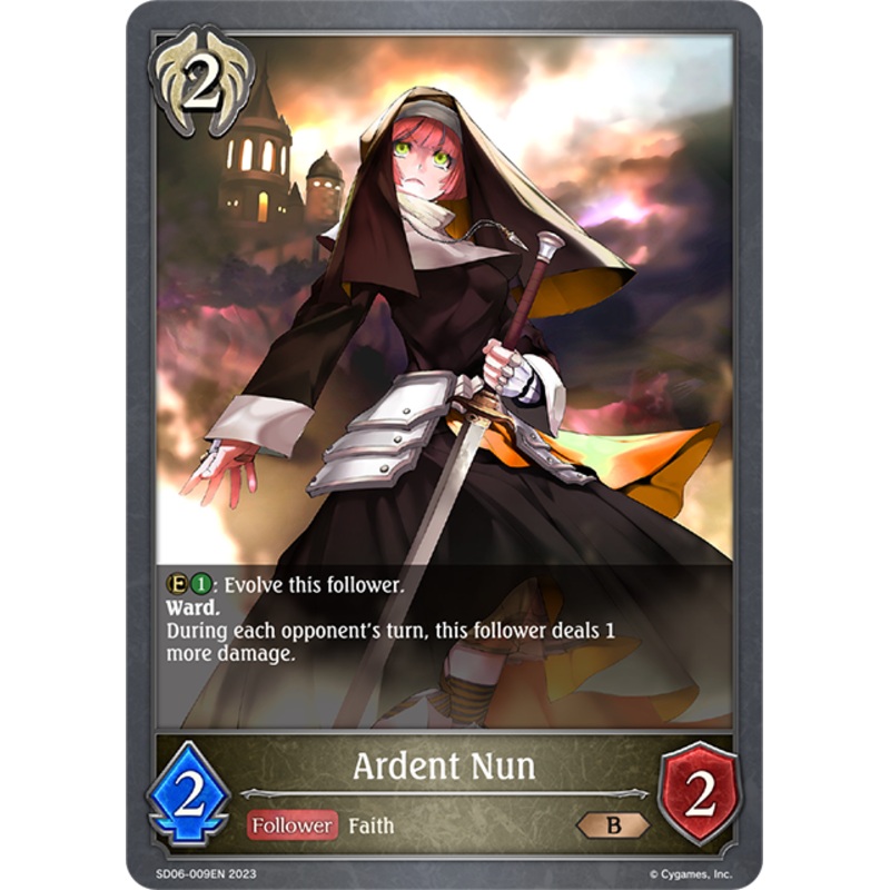 Set Name: Maculate Ablution Release Date: 2023-06-30 Rarity: Bronze Card Name: Ardent Nun Card Number: SD06-009EN Types: Follower Traits: Faith Class: Havencraft Cost: 2 Attack: 2 Defense: 2