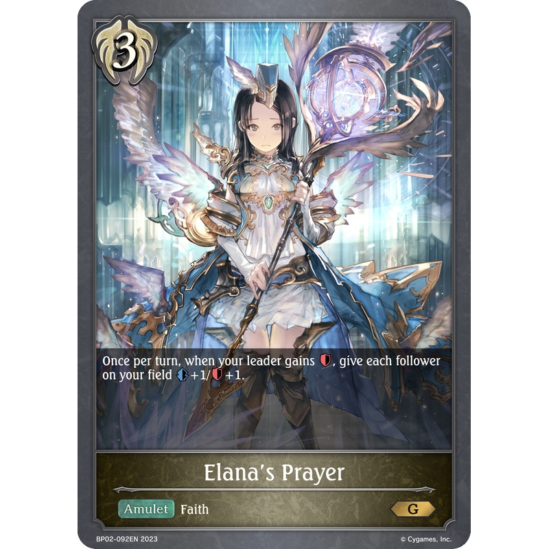 Set Name: Reign of Bahamut Release Date: 2023-09-29 Rarity: Gold Card Name: Elana's Prayer Card Number: BP02-092EN Types: Amulet Traits: Faith Class: Havencraft Cost: 3
