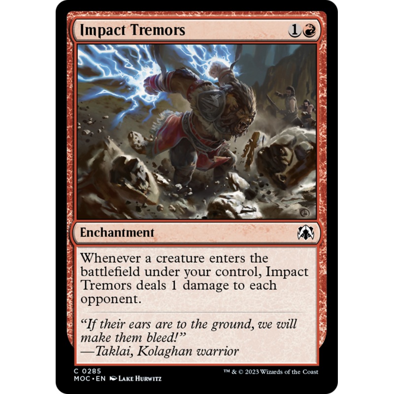 Whenever a creature enters the battlefield under your control, Impact Tremors deals 1 damage to each opponent. If their ears are to the ground, we will make them bleed!Taklai, Kolaghan warrior