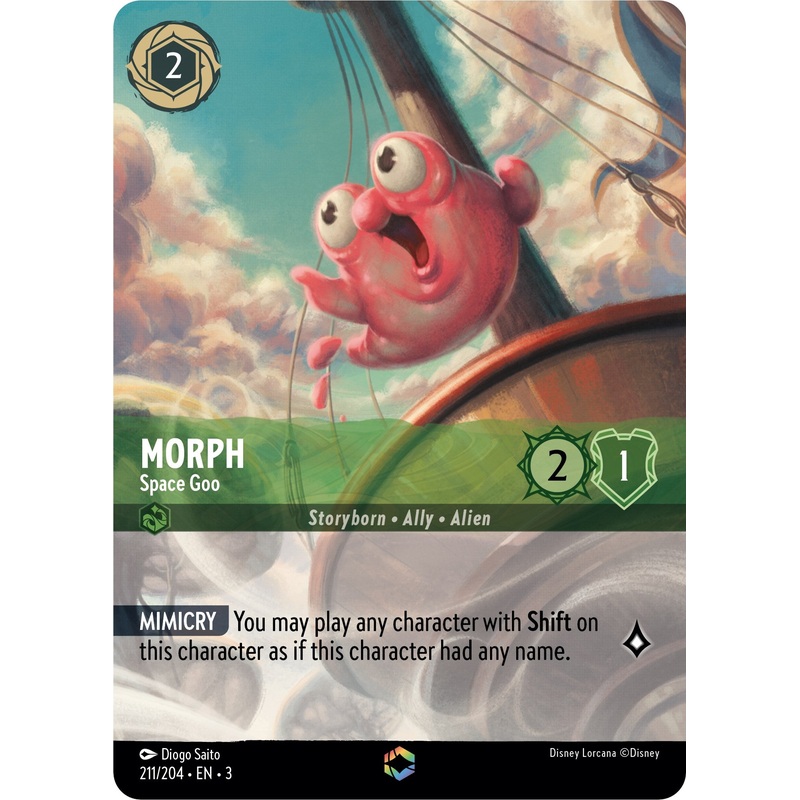Set Name: Into the Inklands Release Date: 2024-02-23 Rarity: Enchanted Cost Ink: 2 Character Version: Space Goo [Mimicry] You may play any character with Shift on this character as if this character had any name.