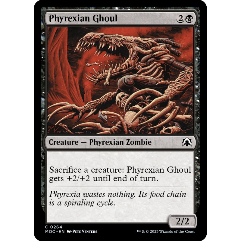 Set: March of the Machine Commander Type: Creature Phyrexian Zombie Rarity: Common Cost: {2}{B} Sacrifice a creature: Phyrexian Ghoul gets +2/+2 until end of turn. Phyrexia wastes nothing. Its food chain is a spiraling cycle.